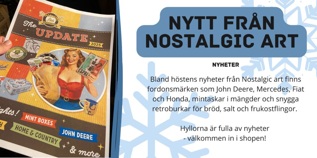 Välkommen till Nostalgishopen.se – din webbshop för retro inredning! Här hittar du snygg design i retro stil – muggar, skyltar, klockor och mycket annat med sköna motiv från 50 tal, 60, 70 och 80 tal! Vi har Sveriges största sortiment av Nostalgic art med alla populära märken som Coca cola, Harley Davidson, Volkswagen, BMW och många många fler. Det finns en skylt för var och en och en burk som passar i varje köksskåp! Heminredning, nostalgisk design och alla saker du kan önska dig om du gillar nostalgi och retro inredning!