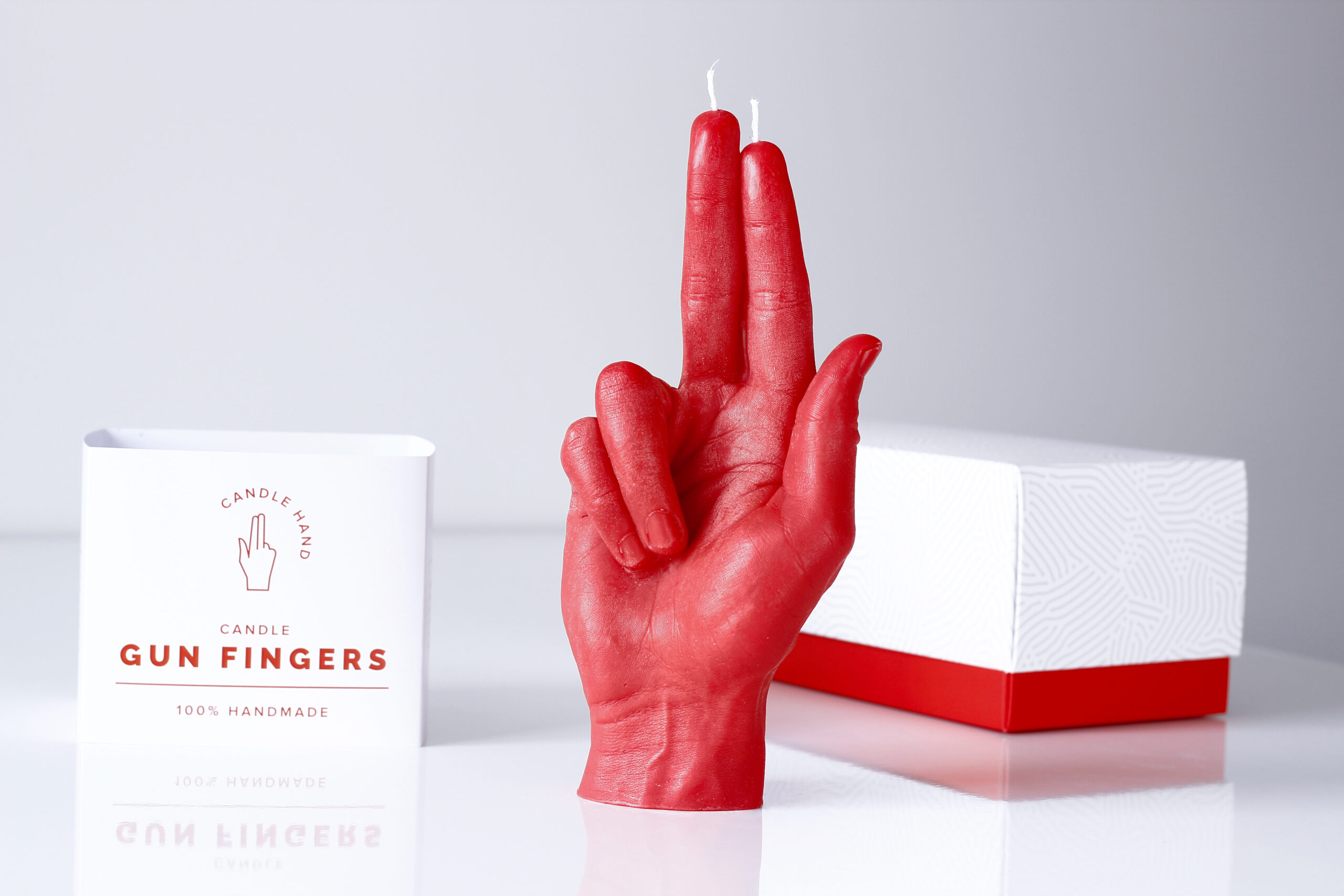 Det enda vapen någon skulle behöva ha, pekar på dig och säger ”Gotcha!” En humoristisk gest i klarröd färg blir en originell inredningsdetalj i ditt eget hem eller en fin present till en vän. Detta handgjorda ljus i hög kvalitet och med otroliga detaljer kommer sticka ut på presentbordet och bli festens ”snackis”.