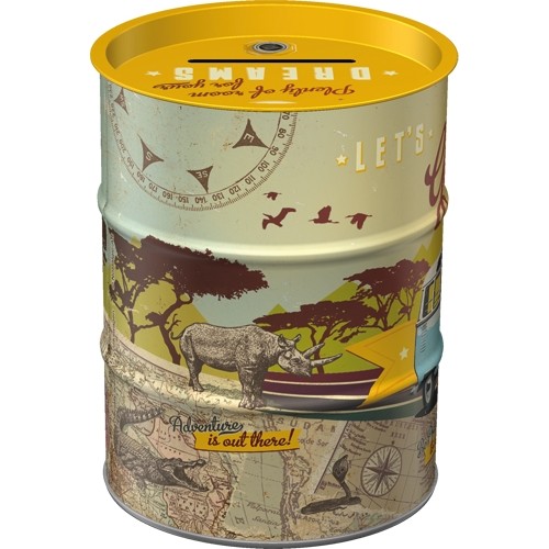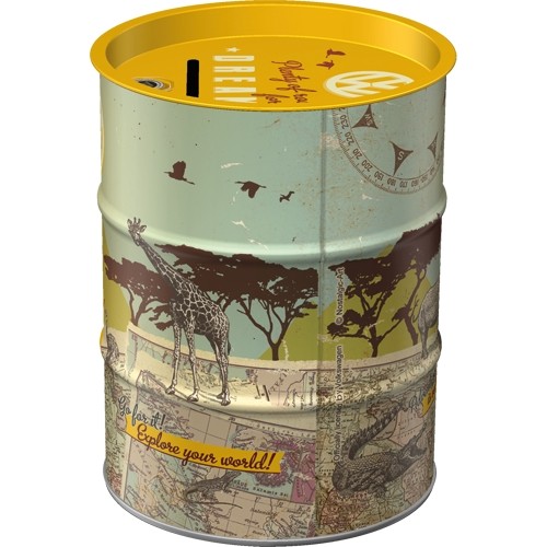 Praktisk rund burk med sköna motiv. Denna modell är 10 x 13 cm och har form av sparbössa (mynt/sedel-springa i topp). Den rymmer 1 liter.